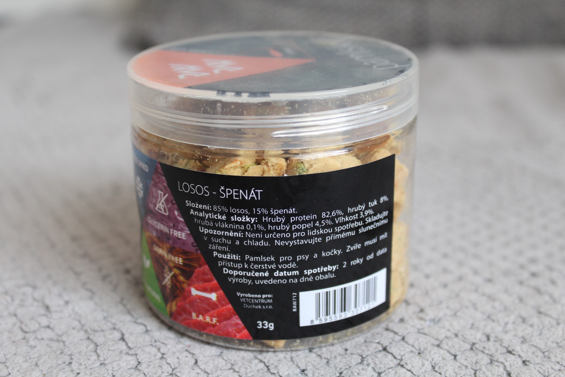 Ale světe div se, našli jsme! Praktická, designová krabička mě upoutala hned, složení mi vyrazilo dech. Jedná se o mrazem sušené maso z lososa s trochou špenátu, vše je nakrájeno na kostičky cca 1 cm. Na jednu krabičku (33g) je použito 250g čerstvého masa. Podívejte se sami, fakt je to pecka. Samozřejmě neskutečně smrdí po rybě, což je pro nás lidi většinou nevýhoda, ale El je po nich jako divá.☺