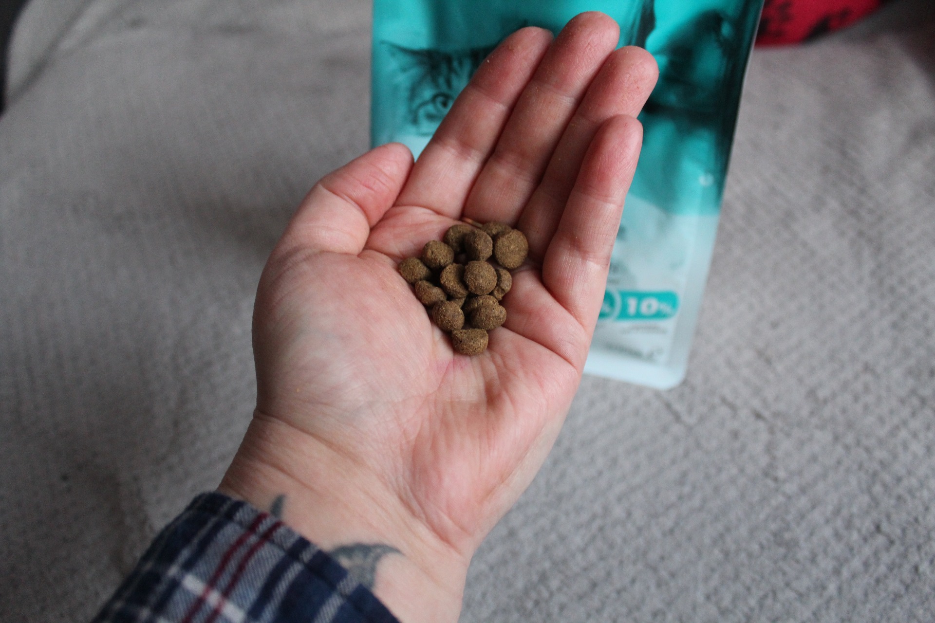 Po otevření vás do nosu praští silná vůně (haha☺) ryby. Granule jsou mastnější, průměr mají kolem 8 mm a jsou kulaté. Řekla bych, že velikostně akorát, alespoň pro tu naši mlsnou papulku. Možná pro kočky, co hodně hltají, by byly malé, ale těžko říct. Rozhodně se mi líbí, že složení je celé dostupné (i v %) na webových stránkách i na obalu, což třeba u Wellness Core, které momentálně kupujeme, není. Musím říct, že jako člověk, který zkouší novou značku granulí, rozhodně chci vědět, co a kolik přesně čeho obsahují, takže za mě plus!